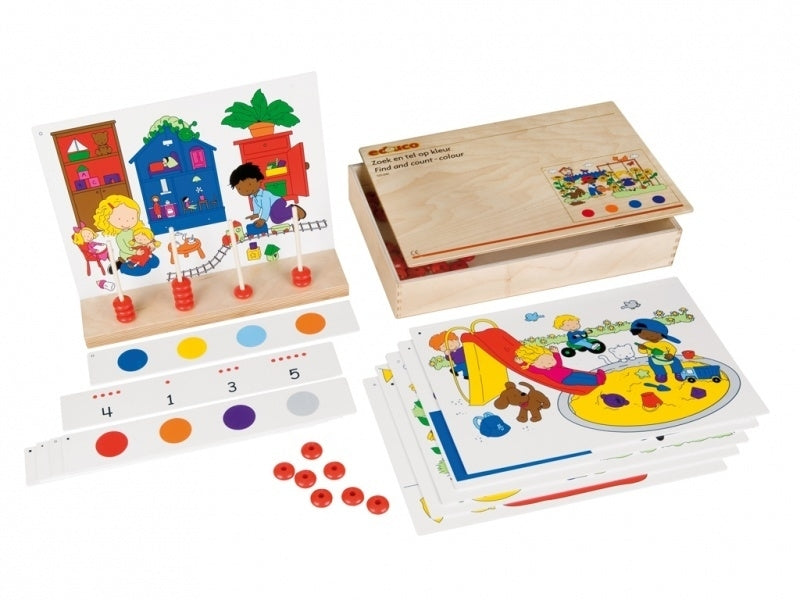 Rekenspel waarbij kinderen de gevraagde kleuren op de themaplaat zoeken, tellen en weergeven door eenzelfde aantal kralen op de standaard te schuiven. Met zelfcontrole.
